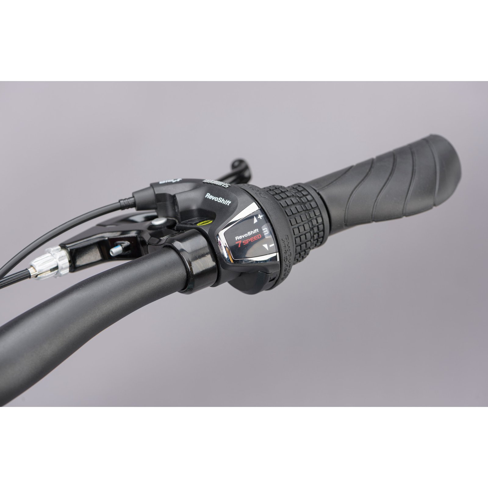Seven wide-ranging gears can be easily selected using the Shimano Revoshift twist shifter. This setup gives a perfect range for flatter environments and rolling hills and is very easy to use.